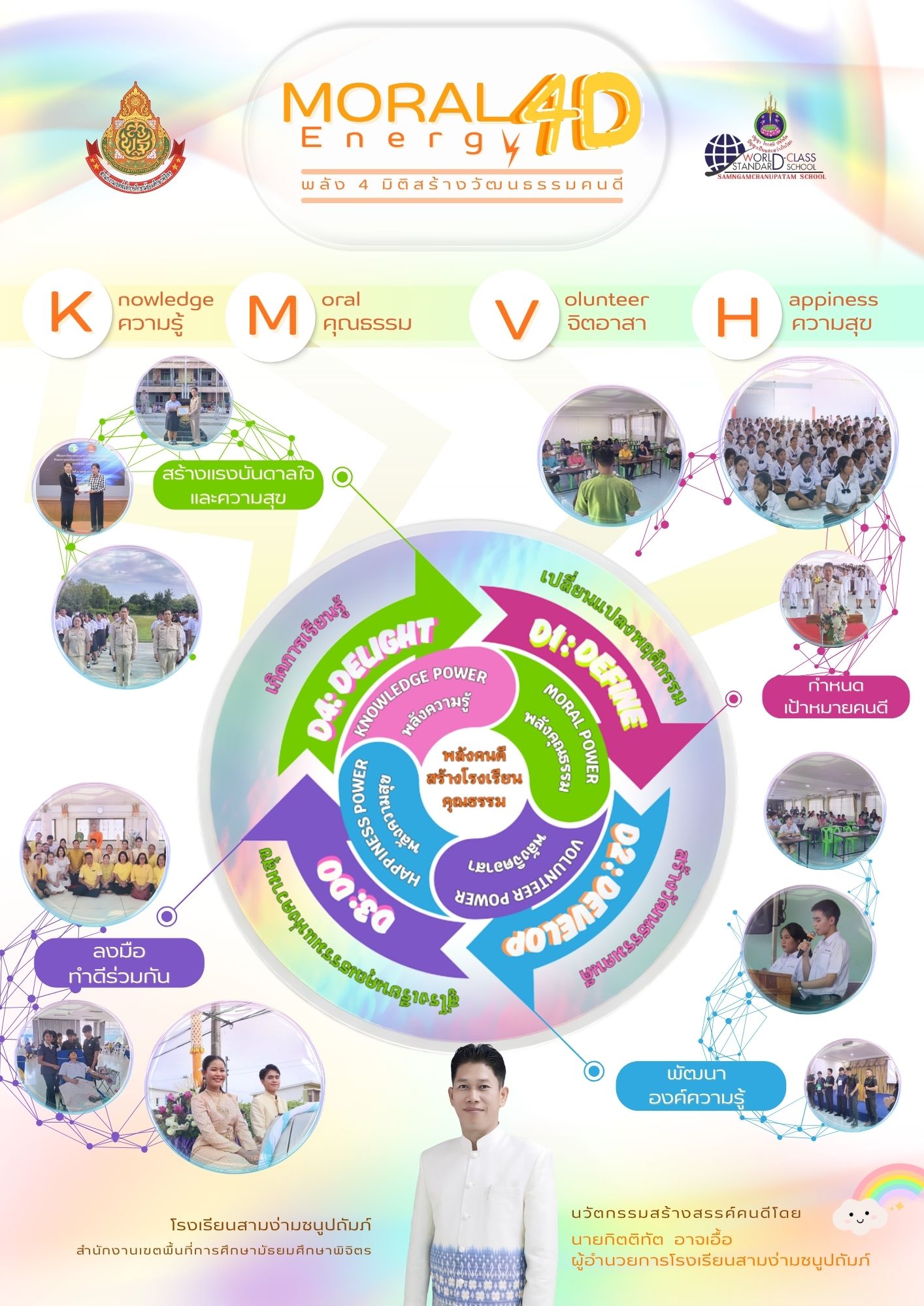 การพัฒนานวัตกรรม “Moral Energy 4D Model : พลัง 4 มิติสร้างวัฒนธรรมคนดี” มีพื้นฐานมาจากแนวคิดการบริหารจัดการเชิงคุณธรรมแบบองค์รวม (Holistic Moral Management) โดยมีหลักการสำคัญคือ “การสร้างวัฒนธรรมคนดีต้องเกิดจากพลังร่วมของทุกคนในองค์กร” ไม่ใช่เพียงการปลูกฝังผ่านกิจกรรมเฉพาะจุด แต่ต้องเชื่อมโยงการบริหาร การเรียนรู้ และการมีส่วนร่วมของทุกภาคส่วนเพื่อตอบสนองต่อสภาพปัญหาที่โรงเรียนยังขาดความต่อเนื่องในการพัฒนาคุณธรรมและแรงจูงใจภายในของผู้เรียนและบุคลากร แนวคิดของนวัตกรรมนี้ตั้งอยู่บนหลักการว่า“การสร้างคนดีอย่างยั่งยืน ต้องอาศัยพลัง 4 มิติ ที่หล่อหลอมความคิด จิตใจ และการกระทำของบุคคลให้สอดคล้องกับคุณธรรม”